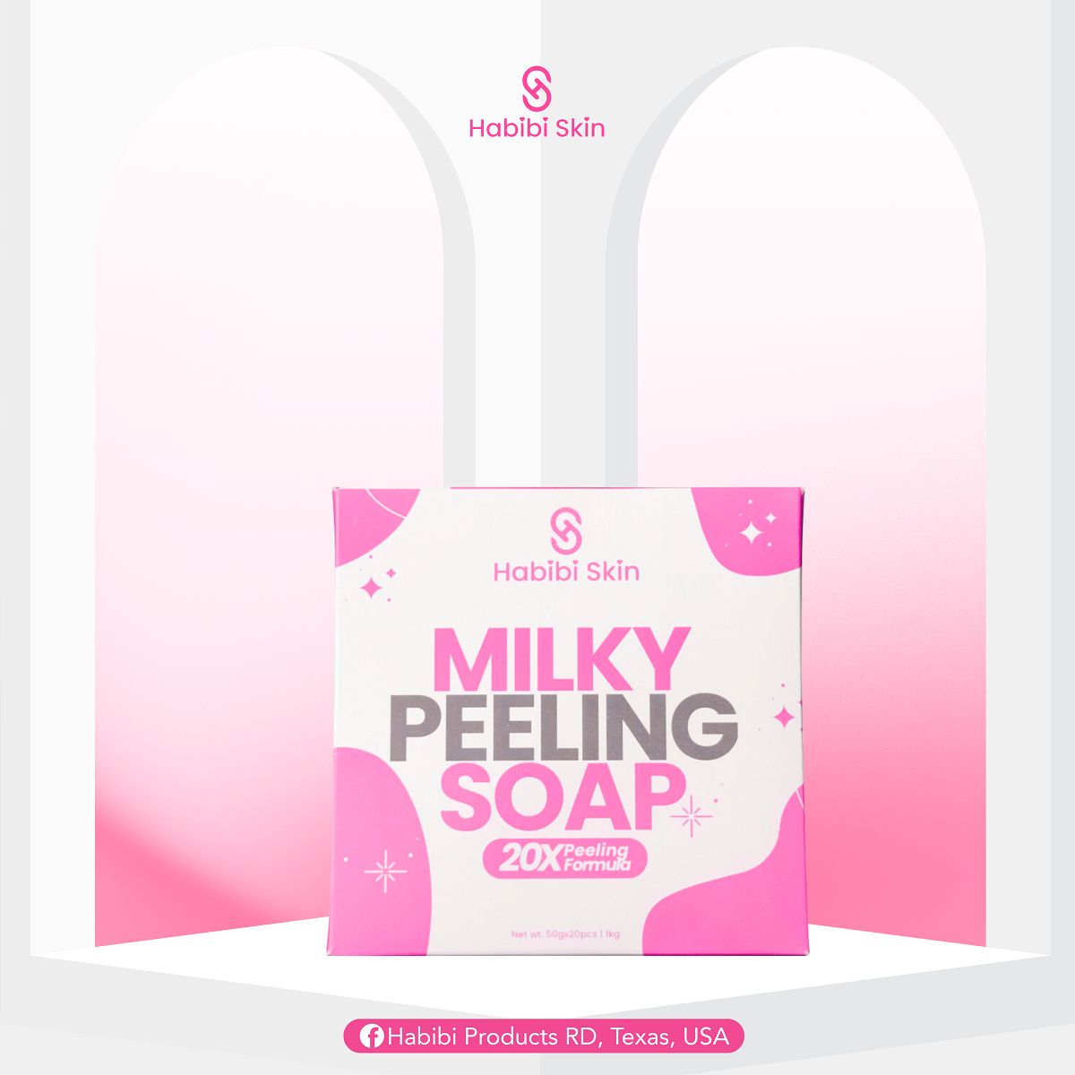 Habibi Skin Milky Peeling Soap is an intensive exfoliating cleansing bar formulated to deep- clean, gently peel, and visibly brighten the skin. Powered by an advanced 20X Peeling Formula, this soap helps remove dead skin cells, surface impurities, and buildup that contribute to dullness, uneven tone, and rough texture—revealing smoother, clearer- looking skin with consistent use.